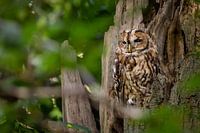 Deze foto toont een prachtige bosuil (Strix aluco) die verscholen zit in een boomholte in de Veluwe, een van de bekendste natuurgebieden van Nederland. Met zijn bruin gevlekte verenkleed en ronde donkere ogen gaat de bosuil haast volledig op in de omgeving, waardoor hij perfect gecamoufleerd is tegen het boomschors. Dit nacht actieve roofdier staat bekend om zijn herkenbare roep en jaagt voornamelijk op kleine zoogdieren, vogels en insecten.