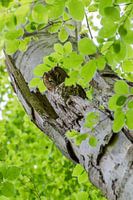 Een bosuil in het vroege voorjaar met frisgroen blad. Door zijn schutkleuren loopt menig mens aan hem voorbij. Hier zit de bosuil in een overblijfsel van een nog rechtopstaande beukenboom. Als je het niet weet, dan zie je hem niet.