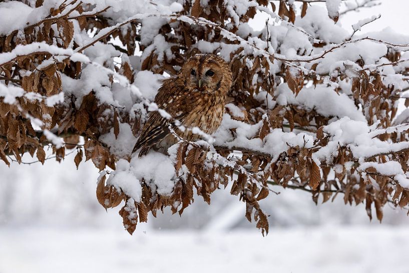 Normaal gesproken zie je hem niet, zo tussen de bruine blaadjes. Maar als er sneeuw ligt, wordt het een ander verhaal.