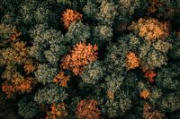 Een kleurrijk bladerdak van groen en koper strekt zich uit onder de hemel, waar individuele bomen oplichten in heldere herfstkleuren. Het zachte spel van licht en schaduw verleent het landschap een melancholische schoonheid, terwijl de rustieke kleurtonen de veranderende seizoenen belichamen - een harmonieus mozaïek van de natuur.