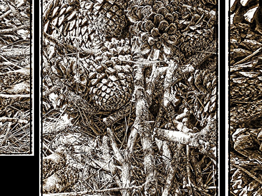 Gemaakt als een drieluik met drie panelen op een zwarte achtergrond, toont dit beeld een sepia-interpretatie van een foto genomen in mijn bos. Onder de naam Woodland Finds Sepia Triptych zijn de 'vondsten' een massa dennenappels, stokken, twijgen en bladeren.