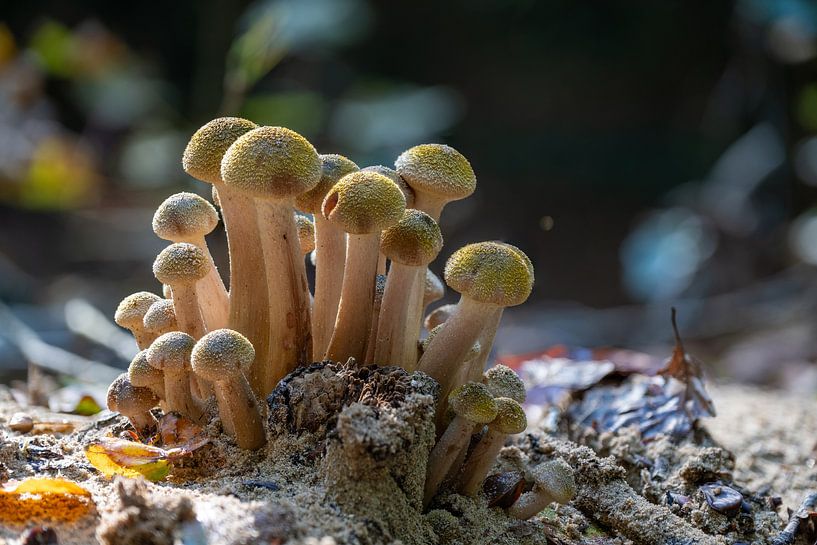 Een intiem portret van de herfst in al haar detail. In de beschutting van het bos vormt zich een hechte kolonie van jonge honingzwamme, fier oprijzend uit de zandgrond. Deze scherpe macro-opname legt de unieke texturen en de subtiele goudbruine tinten van de hoedjes vast, prachtig verlicht door het gefilterde zonlicht. Een sfeervol…