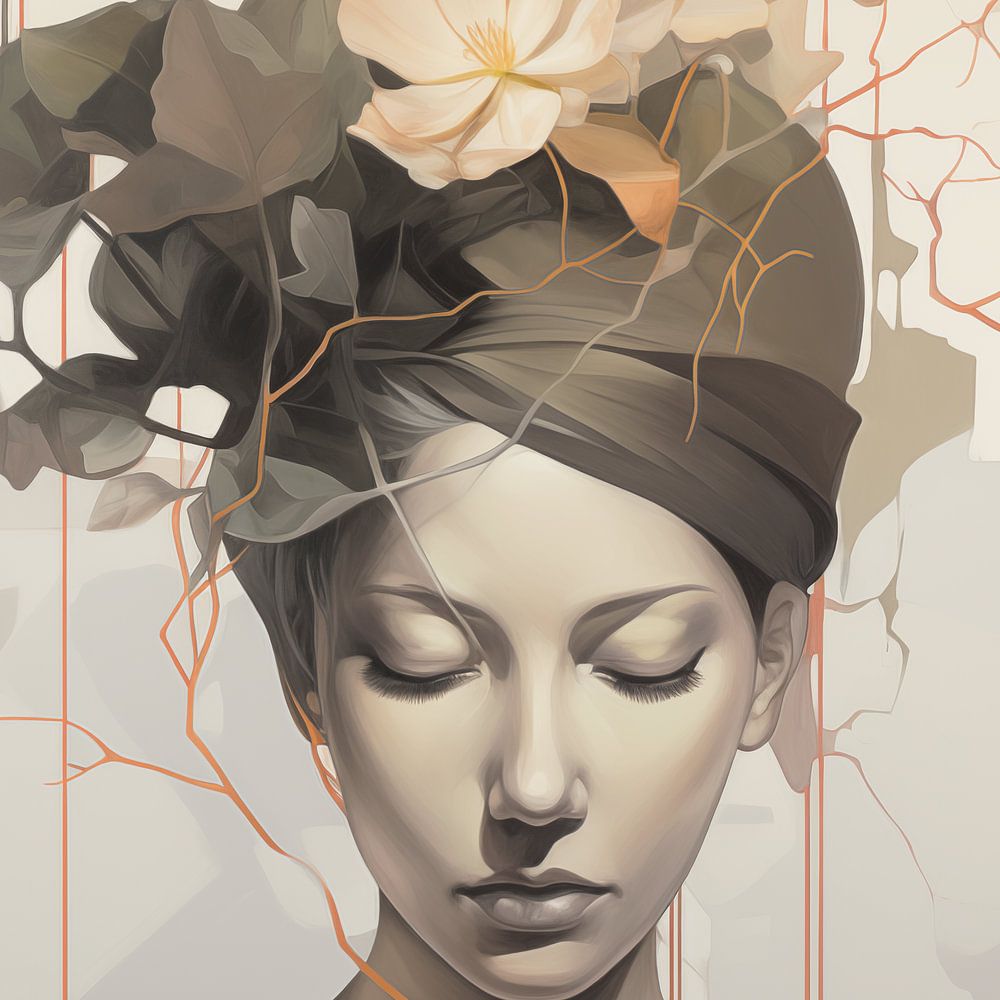 Een samensmelting van mens en natuur. Een portret van een vrouw met bloemen en planten.