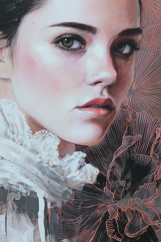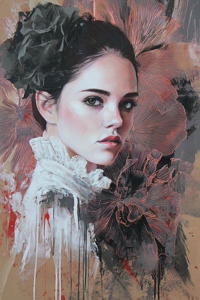 Een elegant portret waarin zachtheid en intensiteit samenkomen. De vrouw kijkt je recht aan, terwijl bloemen en verfspatten om haar heen lijken te exploderen. Het voelt alsof schoonheid hier niet perfect is, maar juist rauw en kwetsbaar.