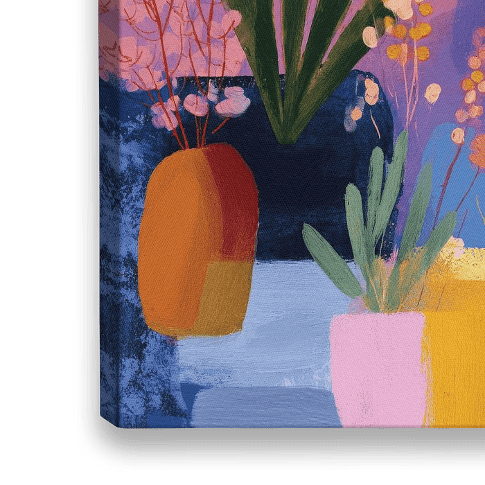 Een vrolijk en eigentijds kunstwerk waarin planten en bloemen de hoofdrol spelen. De levendige kleurencombinaties van roze, paars, oranje en groen brengen direct energie en optimisme in de ruimte. De speelse composities van potten en bladeren geven een modern, licht en artistiek karakter – perfect voor een interieur dat warmte en kleur verdient.