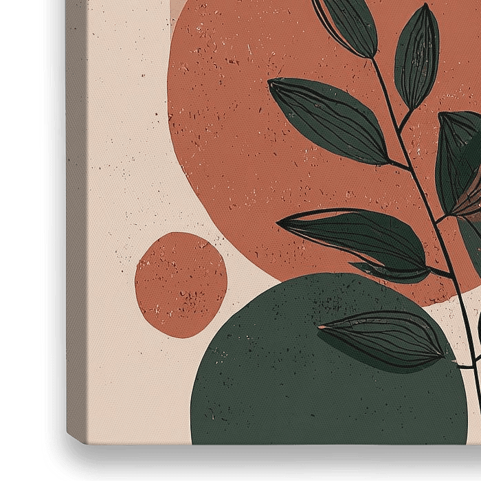 Botanisch Bladeren - Dit is een botanisch schilderij met een groene tak die prachtige bladeren toont, omringd door abstracte bollen in warme aardetinten, wat de moderne, minimalistische stijl accentueert.