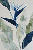 gestileerde botanische compositie waarin abstractie en natuur vloeiend in elkaar overlopen. De voorstelling toont verschillende bladeren en een centrale bloemvorm die doet denken aan een paradijsvogelbloem. De vormen zijn opgebouwd uit geometrische vlakken met zichtbare penseelstreken in een subtiel kleurverloop van groentinten tot…