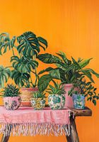 Botanisch in Pastel op Oranje" is een serene compositie die de delicate schoonheid van natuur en kleur omarmt. Het stilleven toont een verzameling van verschillende groene planten, elk zorgvuldig geplaatst in potten van zachte pasteltinten zoals lichtblauw, zachtroze, en mintgroen. Deze potten staan op een oud, verweerd houten bankje, dat een gevoel van tijdloosheid en rust uitstraalt.