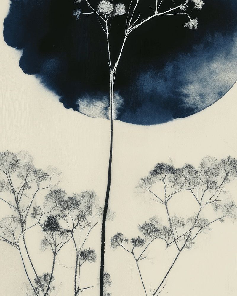 Botanisch in kobalt blauw. Digital art, geïnspireerd op cyanotypie en aquarel. Wabi-sabi, Japani, zen en nieuw landelijk. Kies zelf het formaat en materiaal bij dit werk.