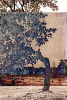 Een botanisch kunstwerk van een landschap van een boom met bladeren in de duinen. Het heeft zachte en warme aardekleuren bruin, roodbruin, wit, beige, groen en blauw. Dit kunstwerk is opgebouwd uit meerdere lagen en is gemaakt in de winter in het Nationale Park De Loonse en Drunense Duinen in Nederland.