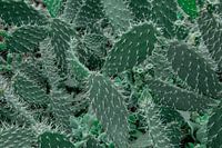 Deze botanische foto toont een groot aantal dicht op elkaar groeiende cactussen die het gehele beeldvlak vullen en een fascinerend natuurlijk patroon vormen. De planten overlappen elkaar lichtjes en creëren zo een complex spel van vormen, lijnen en texturen. In de close-up worden details zichtbaar die men in de natuur vaak over het…