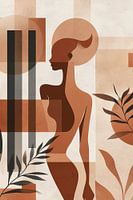 Dit digitale kunstwerk versmelt geometrische abstractie met een gestileerd vrouwelijk silhouet in aardetinten. De compositie balanceert tussen organische curven en strakke lijnen, omringd door abstracte vormen en subtiele botanische elementen. Het minimalistische ontwerp nodigt uit tot reflectie over de relatie tussen mens, natuur en stedelijke omgeving. Door figuratieve en abstracte elementen te combineren, daagt het werk de kijker uit om na te denken over identiteit en moderniteit, terwijl het de essentie van vorm en ruimte in een hedendaagse context verkent.