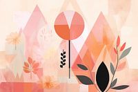 Botanische Geometrie - Dit gestileerde werk flirt met geometrische vormen en botanische elementen tegen een serene achtergrond, waarbij 'Peach Fuzz' een verrukkelijke zachtheid toevoegt. De subtiele overgangen van zalmroze en warme aardetinten worden gecomplementeerd door contrastrijke, donkere bladvormen, wat een hedendaagse harmonie creëert.