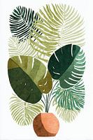 Een botanische illustratie waarin weelderige tropische bladeren in verschillende groentinten harmonieus samenkomen in een terracotta vaas. De compositie toont een verfijnde mix van monstera- en palmbladeren in diepgroene en lichtere sagesteen tinten, wat een rustgevende maar toch levendige sfeer creëert.