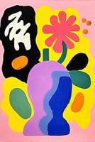 De achtergrond is gevuld met een warme, roze tint die een zachte maar energieke sfeer creëert. Centraal staat een vaas met een dynamische blauw-paarse kleur, die bijna menselijke vormen en…