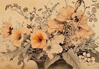 Botanische Kunst - Dit verfijnde bloemenschilderij neemt je mee met zijn elegantie en subtiele kleurschakeringen. De compositie toont een arrangeerwerk van bloemen waarbij de nadruk ligt op een aantal prominente, zalmkleurige bloemen die lijken te dansen tussen de fijne lijnwerk van delicate bladeren en zachtere bloemsoorten. De stijl is natuurgetrouw met een vintage tintje, een ode aan de klassieke botanische illustratie.