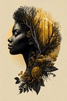 Dit krachtige artwork vangt een moment van rust, verbondenheid en zelfreflectie. In een verfijnde dubbele-exposure versmelten het profiel van een vrouw, weelderige bloemen en een mystiek boslandschap tot één harmonieus geheel. De warme goudtinten contrasteren prachtig met het diep zwart, wat het werk een tijdloze en elegante uitstraling…