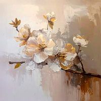 Het goud is subtiel gebruikt in de harten van de bloemen en op de takken, wat een elegante glans toevoegt.