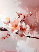 Dit sfeervolle en decoratieve schilderij toont bloesemtakken met weelderige, gelaagde bloemen tegen een zachtroze en crèmekleurige achtergrond.