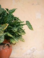 Convent de San Bernardino de Siena in Valladolid is een oud klooster dat je kunt bezoeken als toerist. Dit is een close up van een plant tegen een lichtgele muur. Een foto met een botanische vibe die perfect past in botanisch, modern of scandinavisch interieur.