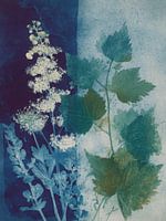 Koop dit abstracte kunstwerk Botanische cyanotype in blauwgroene tinten met gedetailleerde bladeren en bloemen van But First Framing op canvas, aluminium dibond, (ingelijste) fotoprint, behang en ArtFrame, op maat geprint in Fine-Art kwaliteit.