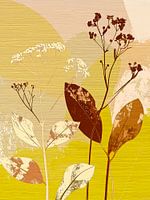 De stijl is een mix van botanische illustratie en abstracte expressionisme, waarbij de natuurlijke vormen van de planten worden gecombineerd met een speelse, gelaagde achtergrond.