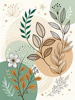 Dit is een moderne lijntekening met abstracte minimalistische botanische elementen. Het ontwerp bevat verschillende gestileerde bladeren, takken en bloemvormen weergegeven met strakke lijnen en subtiele arceringen. Een zacht, gedempt kleurenpalet van groen, bruin, oranje en crème creëert een rustgevend en organisch gevoel. De compositie…