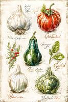 De illustratie toont een zorgvuldig gerangschikte selectie van klassieke plantaardige keukenkruiden, afgebeeld in de stijl van historische botanische illustraties. Elke specerij - van knoflook en oregano tot rozemarijn en artisjokken - is zeer gedetailleerd en levensecht geschilderd, met fijne lijnen en delicate aquarellen, zoals te vinden in oude kruidenboeken uit de 18e of 19e eeuw.