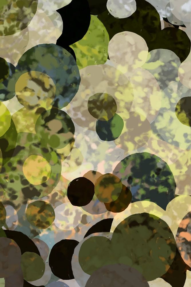 Organische vormen, zachte texturen, fijne penseelstreken.