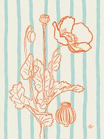 Mooie botanische illustratie van een klaproos in helderrood met blauwgroen gestreepte achtergrond. De zaaddoos is ook afgebeeld.