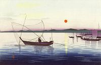 Een beeld van schepen, vissersboten die in Japan voor de kust liggen onder een rode zon boven de horizon. De vissers zijn bezig het brood te verdienen in de economie. Het blauw van het water en paars van de gloed in de hemel steken af tegen het geel van de lucht.
