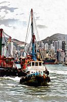 Zo'n 30 jaar geleden bezocht ik Hongkong en werd toen al getroffen door de juxtapositie van oud en nieuw. In dit fotokunstbeeld zien we boten en wolkenkrabbers, de moderne architectuur die hoog oprijst en uitkijkt over de zeehaven waar vissersboten en grotere schepen heen en weer varen in dit drukke district van Hong Kong.