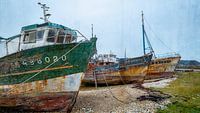 Wrakken van een vissersboten aan de kust van Bretagne.