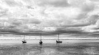 3 boten op het drooggevallen wad (want het is eb) bij Ameland. Een imposante lucht en een reflectie in het natte slik, maakt de foto af. Deze afbeelding is in zwart-wit. Er is ook een kleurenversie beschikbaar.