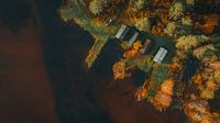Op deze luchtfoto zie je een kleine groep houten botenhuizen aan een rand van het Siljanmeer, niet ver van Leksand, omringd door bomen in warme herfstkleuren. De foto is recht van boven genomen, waardoor de vormen van het landschap bijna grafisch worden. De donkere tinten van het water contrasteren mooi met het goud, oranje en groen van…