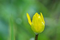 De bijna opengaande knop van een gele boterbloem tegen een pastel groene achtergrond wat een dromerig dromerig effect geeft en een zachte kleurcombinatie.
