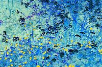 Een fotobewerking van een berm met wilde bloemen uitgevoerd in blauwtinten. Alleen de botterbloemen heb ik geel gelaten voor het contrast. Er is een andere uitvoering die de plaat wat zachter maakt met een witte rand. Deze is waarschijnlijk beter als behang.