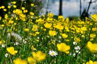 Deze foto heb ik in het park gemaakt. Er is al een tijdje niet gemaaid met fleurig resultaat. Er zijn overal bloemenweides ontstaan. Tussen de boterbloemen staan madeliefjes en een pluizenbol van een paardenbloem. Een mooie zonnige en zomerse foto.
