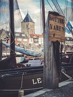 Nostalgisch plaatje van historische visserschepen in de Buitenhaven van Kampen. Op de achtergrond de Buitenkerk.