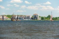Antieke Botters varend in volle zeilen op het Eemmeer met de Eemhof op de achtergrond