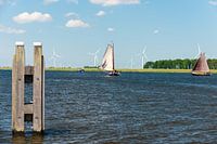 Zeilende Botters op het Eemmeer in volle zeilen en met de windmolens op de achtergrond.