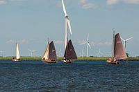 Antieke Botters zeilend op het meer voor Spakenburg met windmolens op de achtergrond.
