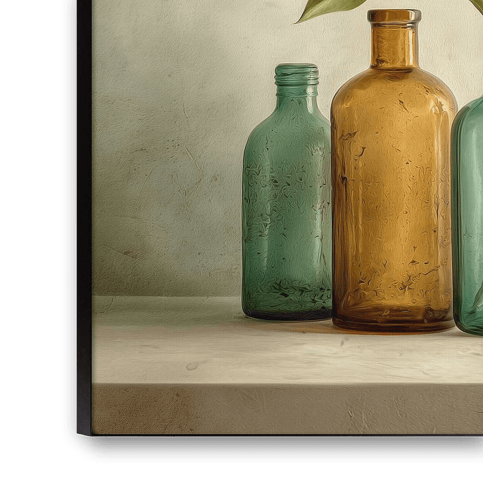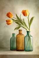 Drie gekleurde vintage flessen dragen zacht gebogen tulpen. De combinatie van glas, licht en bloemen zorgt voor een eenvoudig maar verfijnd stilleven.