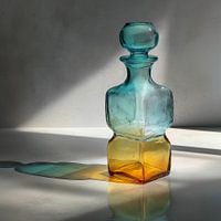 Werk 1 van 3 uit de serie 'Bottled Up Amber-Aqua' Glasstillevens. Een mondgeblazen karaf met vierkante voet en bolle kop vangt een schuine baan daglicht. Bovenin loopt het glas koeltjes blauwgroen weg, onderin gloeit het als honing. In de schaduw op het tafelblad zie je die twee kleuren terug als een zachte strook—net een…
