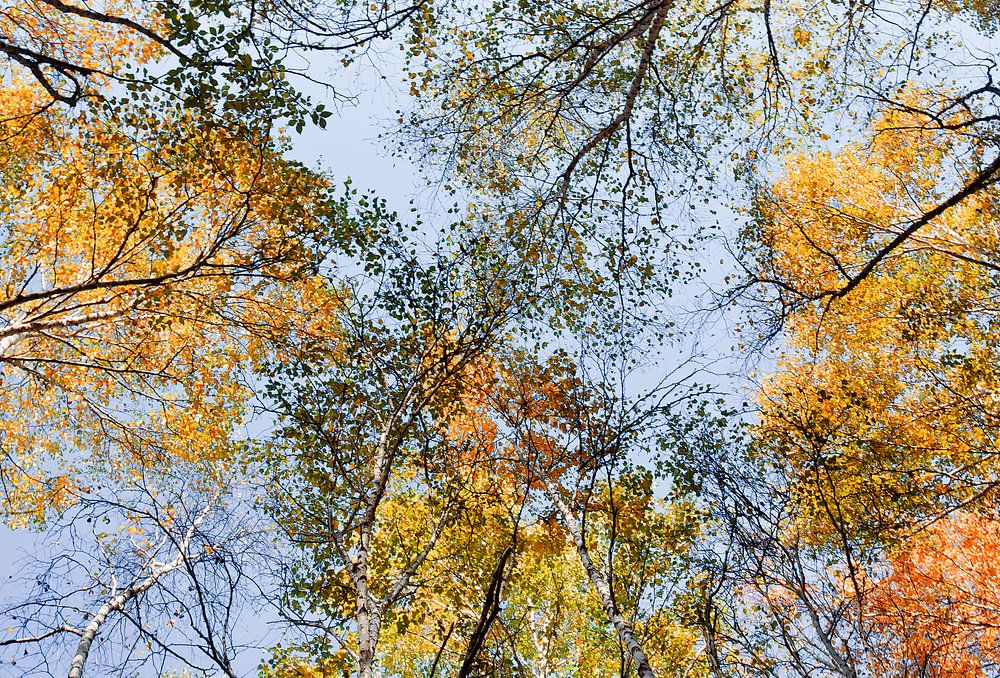 Bottom up groothoek opname van berken in de herfst pastel kleuren tegen een blauwe hemel