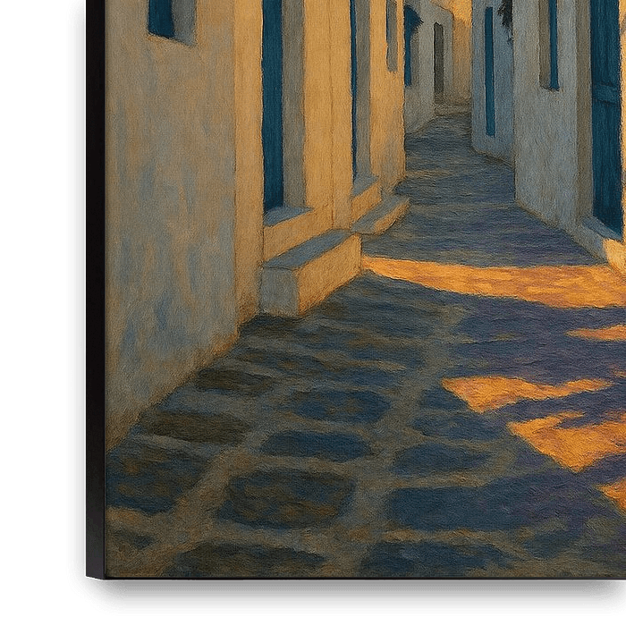 Paros in Avondlicht distilleert de essentie van de Cycladen in één rustige straat. Het smalle stenen pad slingert tussen witgekalkte muren door terwijl de laatste zon van de dag in gesmolten oranje over de grond valt. Daarboven overspoelt een waterval van magenta bougainville de architectuur als een levende vlam. De kunstenaar,…