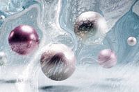 Abstract schilderij in blauw,wit en roze tinten met bubbels/parels in beweging