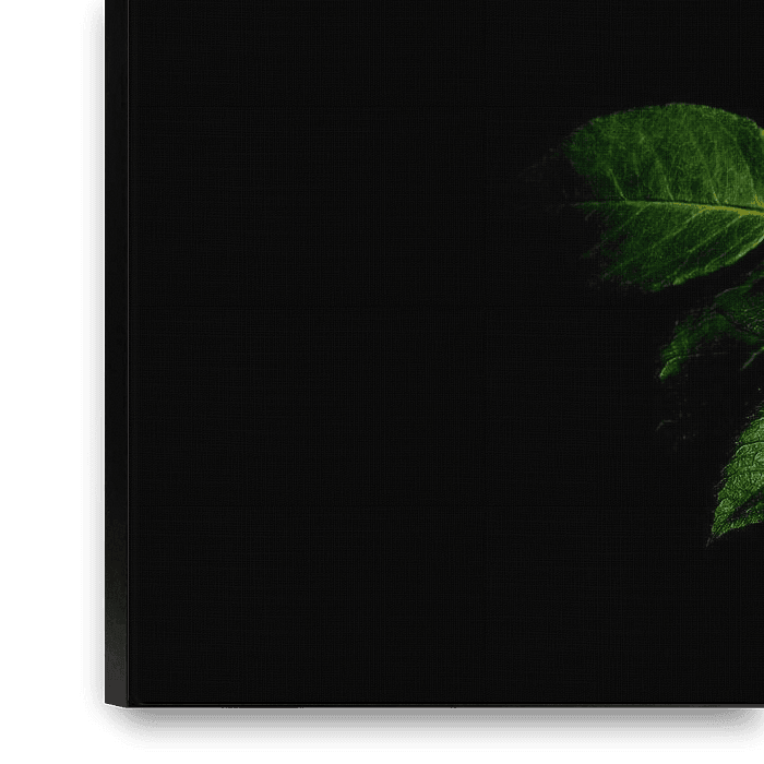 Deze roos, rood met een witte kern, is contrastrijk gefotografeerd tegen een zwarte achtergrond en geflankeerd door de groene blaadjes van de bloem. De zwarte achtergrond , groene blaadjes van de roos en de rode met witte bloem in het centrum vormt, mede door de lichtinval voor een mooi kleurrijke foto voor aan de muur . Een…