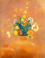 Mosterdgeel schilderij met vrolijke zomerbloemen en twee ronde vazen, mixed media fantasie