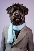 Deze Bouvier des Flandres presenteert zich trots en stijlvol in een elegant grijs pak, met als highlight een zachte, lichtblauwe sjaal. Met zijn dikke, pluizige vacht en expressieve ogen straalt hij een charmante mix van waardigheid en speelsheid uit. Een echte heer op vier poten!